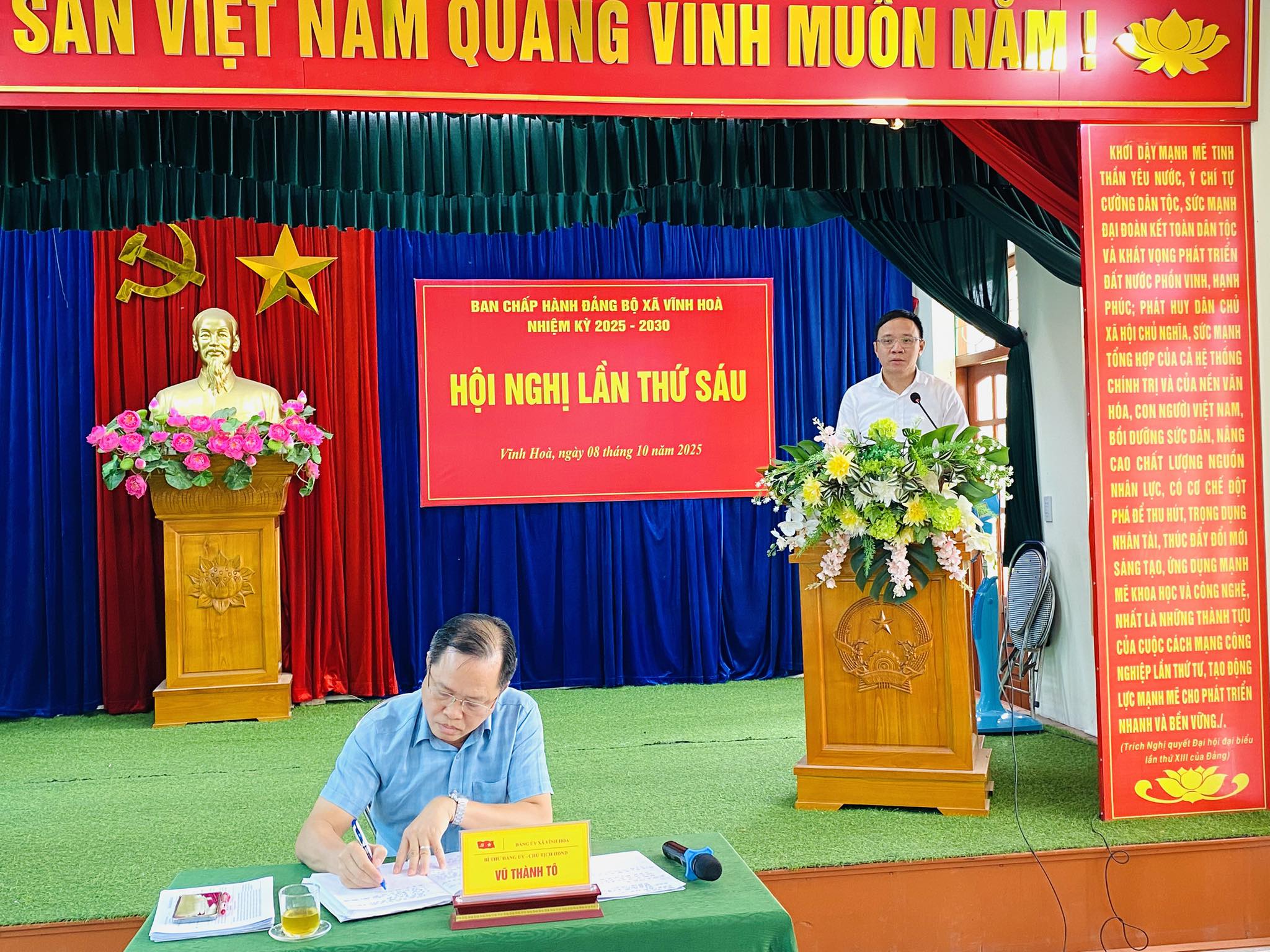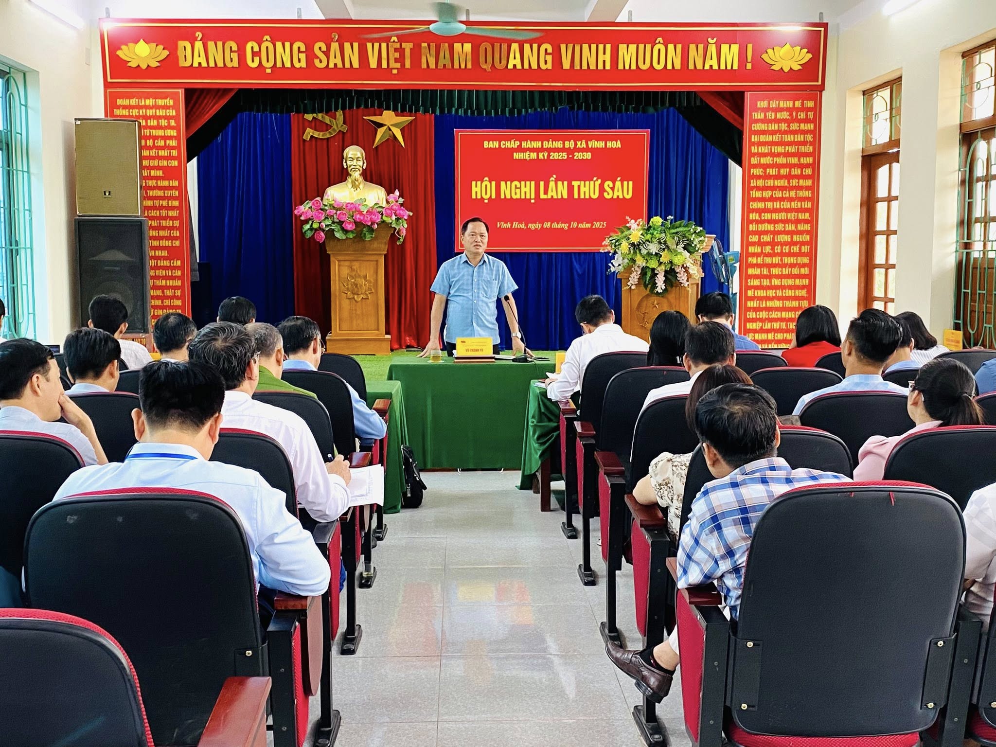 Thực hiện chương trình công tác 6 tháng cuối năm của Đảng ủy, Ban Thường vụ Đảng ủy; Sáng ngày 08/10/2025, Đảng uỷ xã Vĩnh Hòa tổ chức Hội nghị Ban Chấp hành lần thứ 6 kiểm điểm đánh giá tình hình thực hiện nhiệm vụ 9 tháng đầu năm và nhiệm vụ, giải pháp trọng tâm 3 tháng cuối năm 2025 và thông qua một số nội dung, chương trình theo quy chế hoạt động. Dự và chỉ đạo Hội nghị Đồng chí Đào Trọng Đức - ủy viên Ban Thường vụ Thành ủy, Chánh Văn phòng Thành ủy, phụ trách Đảng bộ xã.