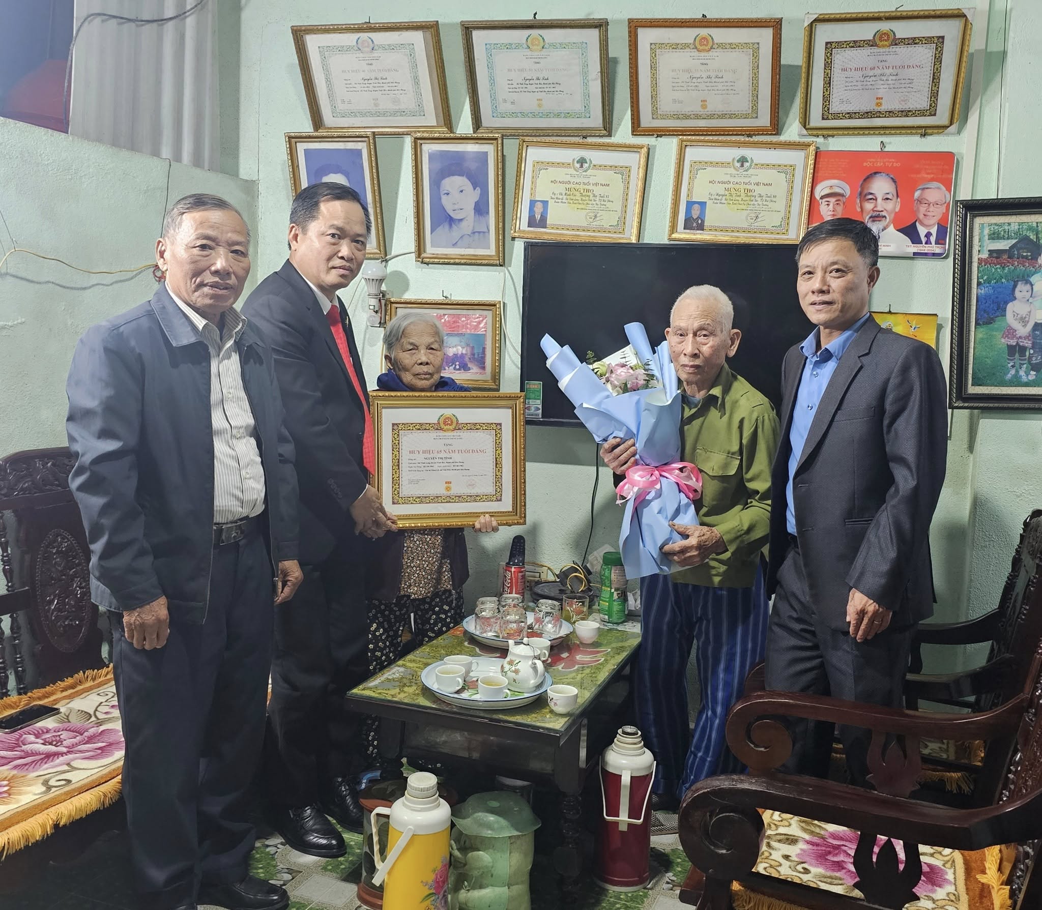Đồng chí Vũ Thành Tô - Bí thư Đảng ủy, Chủ tịch HĐND xã trao Huy hiệu 65 năm tuổi Đảng cho đảng viên Nguyễn Thị Tính2. Đồng chí Phạm Văn Phương, đảng viên Chi bộ Thượng Đồng, Huy hiệu 60 năm tuổi Đảng.