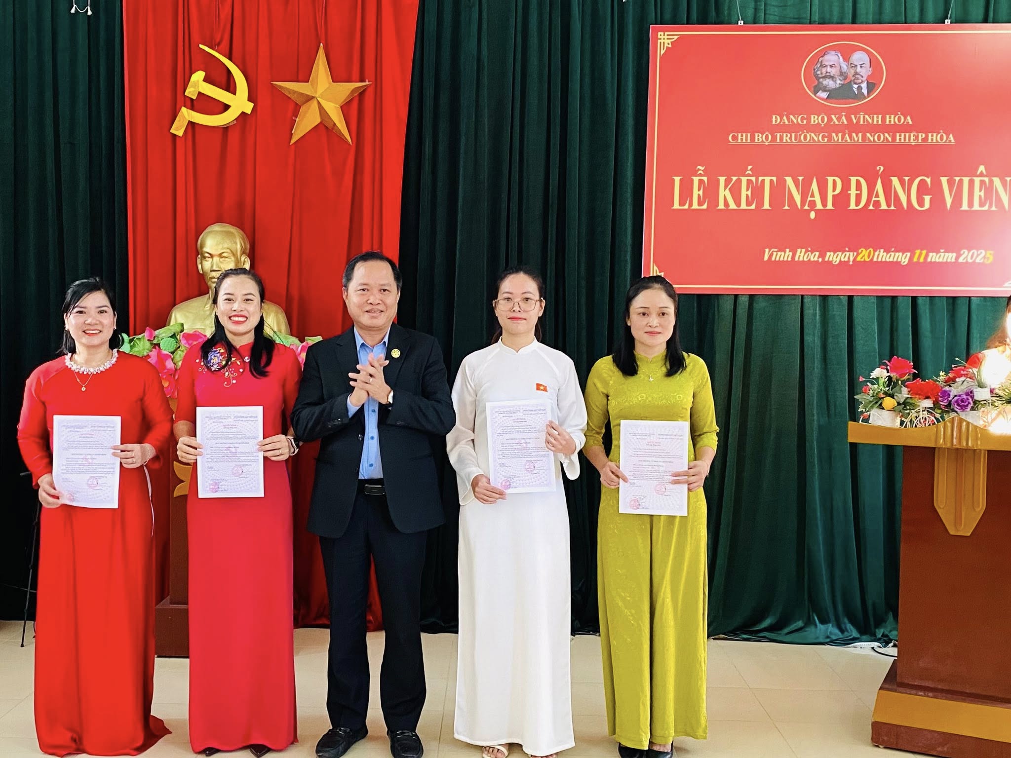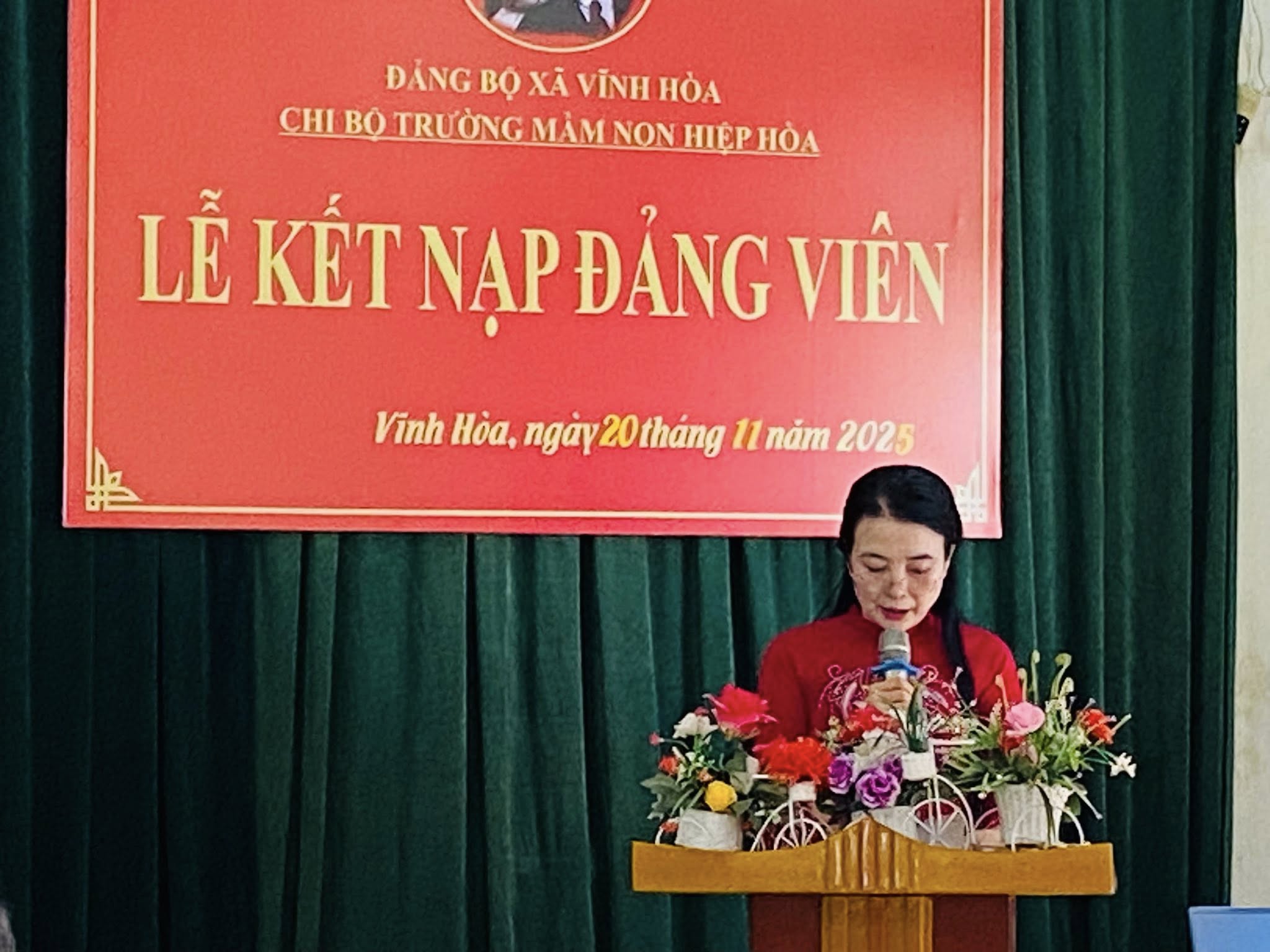 Thực hiện Nghị quyết của Chi bộ Trường Mầm non Hiệp Hòa về công tác phát triển Đảng năm 2025, chiều ngày 20/11, Chi bộ Trường Mầm non Hiệp Hòa, xã Vĩnh Hòa, thành phố Hải Phòng đã long trọng tổ chức Lễ kết nạp đảng viên mới cho 04 quần chúng ưu tú: đồng chí Phạm Thị Huyền, đồng chí Dương Thị Huệ, đồng chí Lê Hương Thanh và đồng chí Nguyễn Thị Tâm. Buổi lễ diễn ra trong không khí trang nghiêm, đúng trình tự, thủ tục theo Điều lệ Đảng Cộng sản Việt Nam.