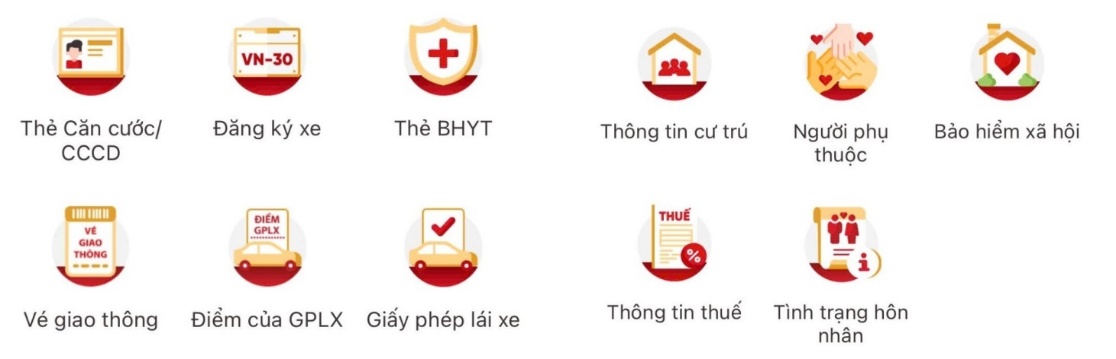 Với định danh mức 1 trên VNeID, người dân có thể khai báo y tế lẫn tiêm chủng. Với định danh mức 2, ứng dụng có thể tích hợp nhiều giấy tờ quan trọng để sử dụng thay bản cứng, gồm căn cước công dân, giấy tạm trú, tạm vắng, giấy phép lái xe, đăng ký xe, mã số bảo hiểm xã hội, người phụ thuộc, tình trạng hôn nhân.