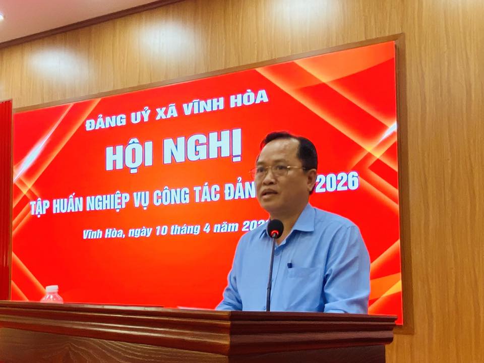 Thực hiện Chương trình công tác năm 2026, sáng ngày 10 tháng 4 năm 2026, Ban Thường vụ Đảng ủy xã Vĩnh Hòa đã tổ chức Hội nghị tập huấn nghiệp vụ công tác Đảng năm 2026 tại Nhà Văn hóa xã, với sự tham dự của đông đủ các đồng chí trong Thường trực Đảng ủy, Ban Thường vụ Đảng ủy, Ban Chấp hành Đảng bộ xã; lãnh đạo các ban, ngành, đoàn thể và đội ngũ bí thư, phó bí thư, chi ủy viên các chi bộ trực thuộc.